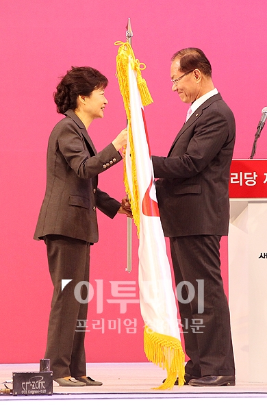 새누리당 박근혜 비상대책위원장이 15일 오후 경기도 일산 킨텍스에서 열린 새누리당 제1차 전당대회에서 대표최고위원에 선출된 황우여 신임대표에게 당기를 전달하고 있다.