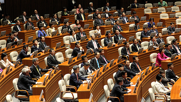 제19대 국회 초선의원들이 17일 국회 본회의장에서 사무처직원으로부터 설명을 듣고 있다.
