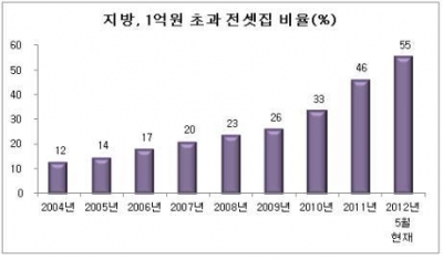 17일 부동산정보업체 부동산써브가 수도권을 제외한 지방 아파트(주상복합 포함) 286만2460가구를 대상으로 1억원을 초과하는 전셋집 비율을 분석한 결과 55%로 나타났다. 이는 12%를 기록했던 지난 2004년에 비해 43%나 급등한 수치다.