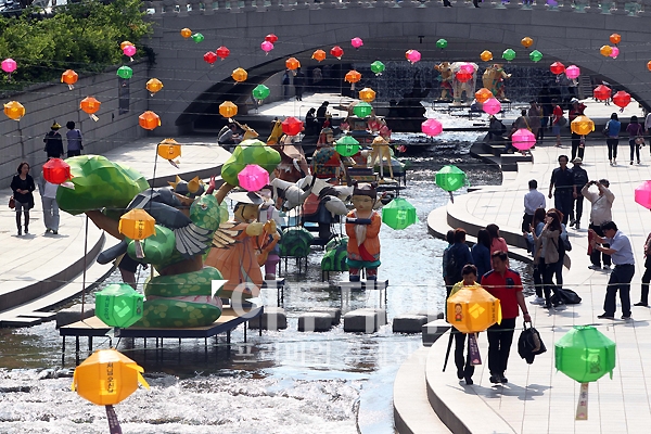 부처님 오신 날을 열흘 앞두고 있는 17일 오후 서울 청계천에 불교를 상징하는 연등 조형물들이 설치되어 시민들의 시선을 끌고 있다.
