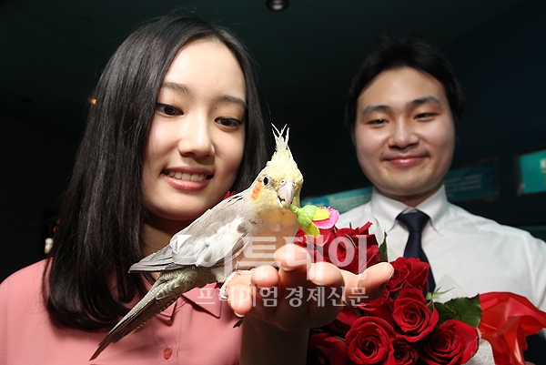 성년의 날을 하루 앞둔 20일 오전 서울 여의도 63씨월드에서 열린 아쿠아 로즈 이벤트에서 앵무새가 성년을 맞은 여성에게 장미꽃을 건네고 있다. 63씨월드의 '아쿠아 로즈 이벤트'는 5월 21일 오후 6시부터 8시까지 2시간 동안 진행된다.