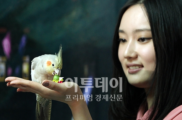 성년의 날을 하루 앞둔 20일 오전 서울 여의도 63씨월드에서 열린 아쿠아 로즈 이벤트에서 앵무새가 성년을 맞은 여성에게 장미꽃을 건네고 있다. 63씨월드의 '아쿠아 로즈 이벤트'는 5월 21일 오후 6시부터 8시까지 2시간 동안 진행된다.