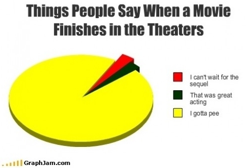 게재된 그래프의 결과에 따르면 영화 관람 후 가장 많이 하는 말은 "나 화장실 갈래"인 것으로 나타났다. 무려 90% 이상을 차지했다. 이어 "빨리 다음 편이 보고 싶다"와 "배우들 연기가 훌륭하다"가 2위와 3위를 기록했다.