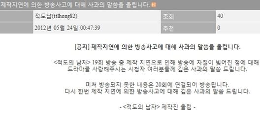 이어 24일 오전 12시47분께 드라마 공식 홈페이지 시청자 게시판을 통해 공식 사과문을 게재했다. 제작진은 "'적도의 남자' 19회 방송 중 제작 지연으로 인해 방송에 차질이 빚어진 점에 대해 드라마를 사랑해주시는 시청자 여러분들께 깊은 사과의 말씀 드립니다"라며 "미처 방송되지 못한 내용은 20회에 연결되어 방송됩니다. 다시 한번 제작 지연에 의한 방송사고에 대해 깊은 사과의 말씀 드립니다"라고 공지했다.