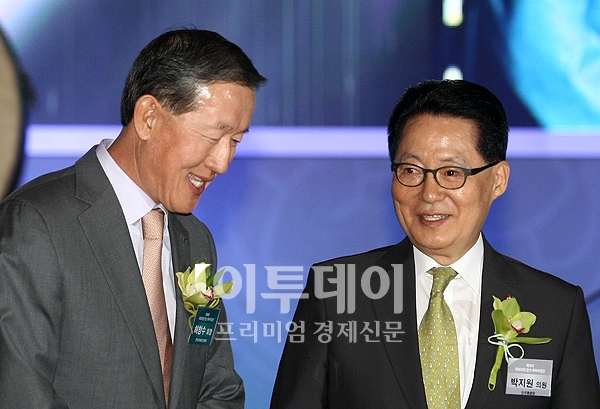 박지원 민주통합당 원내대표(오른쪽)와 허창수 전경련 회장이 30일 오후 서울 여의도 63빌딩 컨벤션홀에서 열린 경제5단체 주최 '19대 국회의원 당선 축하 리셉션'에 참석해 대화를 나누고 있다.