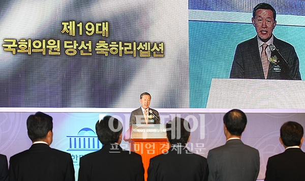 허창수 전경련 회장이 30일 오후 서울 여의도 63빌딩 컨벤션홀에서 열린 경제5단체 주최 '19대 국회의원 당선 축하 리셉션'에서 축사를 하고 있다.