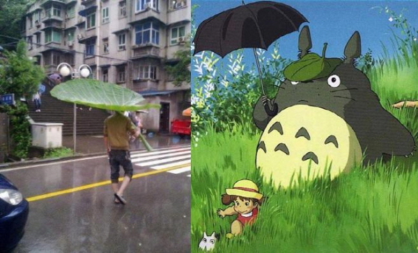 공개된 '친환경 우산' 사진에는 한 남성이 비오는 날 우산 대신 커다란 나뭇잎을 쓰고 거리를 거니는 모습이 담겨있다.