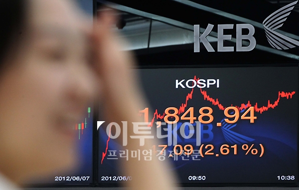 코스피가 미국과 유럽의 경기 부양 기대감에 상승세를 이어가고 있다. 7일 오전 코스피 지수가 47.09 포인트 상승한 1848.94를 나타내고 있다. 이날 오전 을지로 외환은행 본점 딜링룸에서 딜러들이 분주히 움직이고 있다.