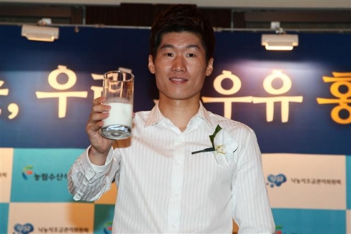 7일 서울 웨스틴조선호텔에서 개최된 우유소비촉진 홍보대사 위촉식에서 박지성 선수가 우유를 들어 보이고 있다.