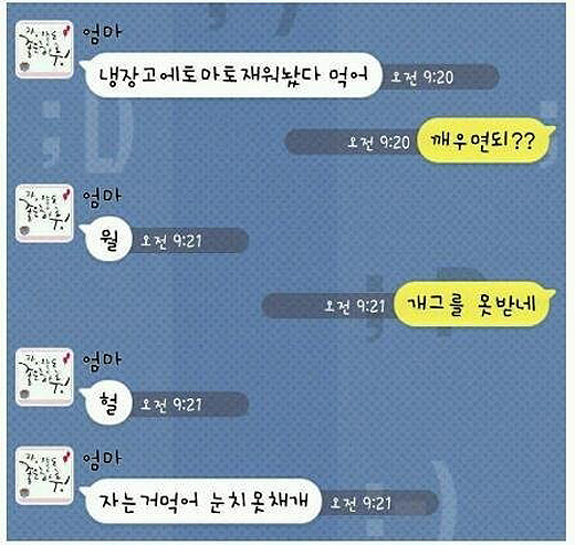 자녀는 “개그를 못 받네”라고 다시 보냈고 엄마는 “헐”이라고 대답하더니, 곧장 개그센스를 발휘해 “자는 거 먹어. 눈치 못채게”라고 답해 보는 이들을 폭소케 했다.