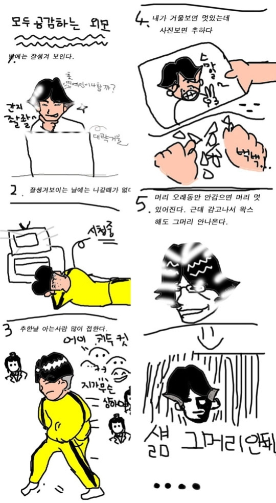 퉵툰 속에는 '밤에 잘 생겨 보인다'. '잘 생겨 보이는 날에 는 나갈 때가 없다''추한 날 아는 사람 많이 접한다' '내가 거울보면 멋있는데 사진보면 추하다' '머리 오랫동안 안 감으면 멋있어진다' 등의 내용이 담겼다.