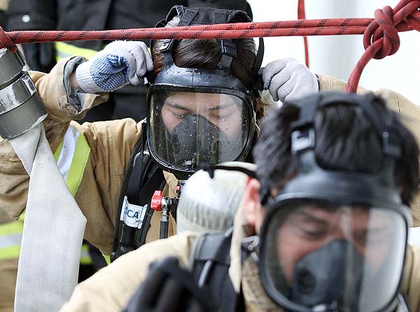 30도를 웃도는 무더위 속에 27일 서초구 서울소방학교에서 지난해 10월 합격한 서울시 신입 소방공무원들이 구슬땀을 흘리며 훈련을 하고 있다. 서울시 신입 소방공무원의 지난해 체력시험 탈락률은 40%였으며 여자소방공무원은 47:1의 결쟁률을 보였다. 이날 9주차 훈련을 받은 94기는 12주의 훈련을 마치고 오는 7월 최일선 119 안전센터로 배치된다.