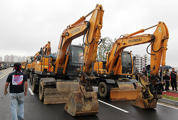 27일 울산건설기계 노조 총파업 출정식이 열린 울산시 중구 혁신도시 건설현장에 건설기계들이 줄지어 멈춰 서 있다.