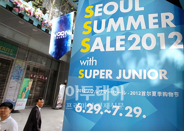 2012 서울섬머세일이 시작된 29일 오전 서울 명동거리에 현수막이 걸려있다. 서울섬머세일은 외국인 관광객을 대상으로 오는 7월 29일까지 명동·동대문 등 주요 백화점과 쇼핑몰, 화장품 브랜드 등 4228개 업체가 참여하는 행사이다.