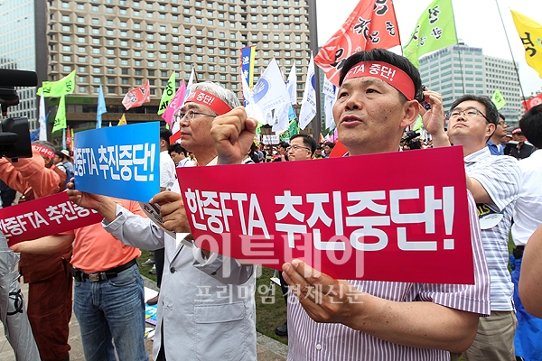 한ㆍ중 FTA 협상 중단 촉구 농어민 대회가 열린 3일 오후 서울 시청앞 광장에서 참석자들이 피켓을 들고 구호를 외치고 있다.