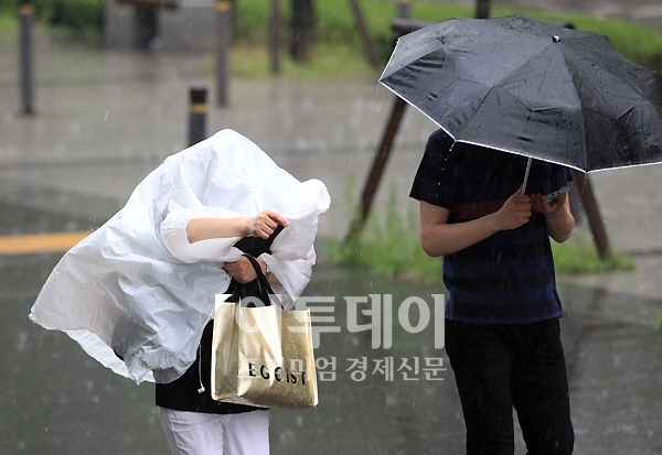 갑자기 쏟아지는 소나기에 우산을 준비 못한 시민들이 비를 맞으며 발걸음을 재촉하고 있다. 3일 오후 여의도.