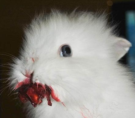 특히 토끼는 체리의 붉은 색이 입가의 하얀 털과 대비돼 강조 돼 보이는 가운데 꼭 흡혈 토끼같은 착시효과를 일으킨다.