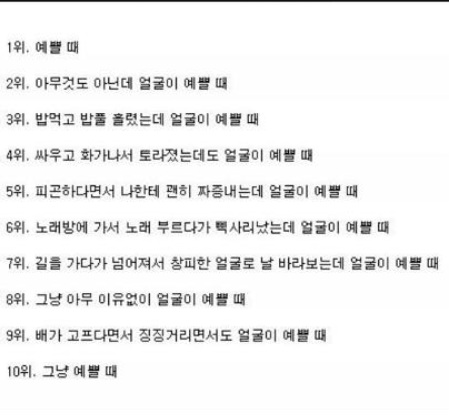 또 2위는 '아무것도 아닌데 얼굴이 예쁠 때'이고, 3위는 '밥 먹고 밥풀 흘렸는데 얼굴이 예쁠 때'이다. 1위에서 10까지 모두 얼굴이 예쁠 때가 포함돼 있어. 결국 남자들은 예쁜 여자에세 반하는 것을 알 수 있다.