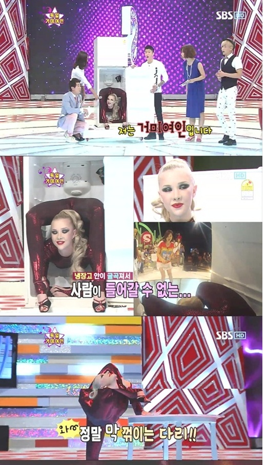 특히 그녀는 몸을 폴더처럼 반으로 접는 등 흡사 연체동물을 연상케 해 출연진은 입을 다물지 못했다.