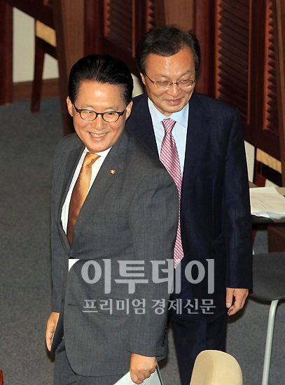 이해찬 민주통합당 대표와 박지원 원내대표가 17일 오전 국회 본회의에 참석하며 밝게 웃고 있다.