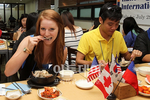 한성대학교 국제여름학교 학생들이 17일 오후 초복을 앞두고 서울 성북구 한성대 창의관 교내식당에서 우리나라의 전통 보양식인 삼계탕을 맛보고 있다.