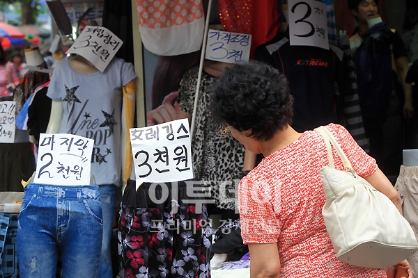 남대문시장에선 옷 한 벌을 2000원, 3000원에 살 수 있다. 요즘 같은 불황에는 쉽게 지갑이 열리지 않지만 이 가격에는 그냥 지나칠 수가 없다. 18일 오후 남대문시장의 한 가게에서 손님들이 옷을 고르고 있다.