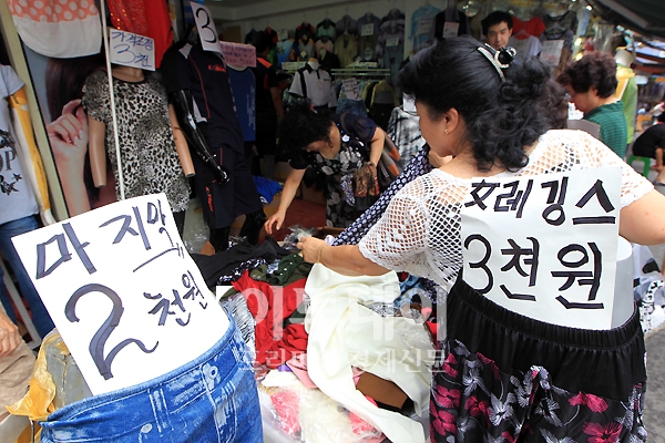 남대문시장에선 옷 한 벌을 2000원, 3000원에 살 수 있다. 요즘 같은 불황에는 쉽게 지갑이 열리지 않지만 이 가격에는 그냥 지나칠 수가 없다. 18일 오후 남대문시장의 한 가게에서 손님들이 옷을 고르고 있다.
