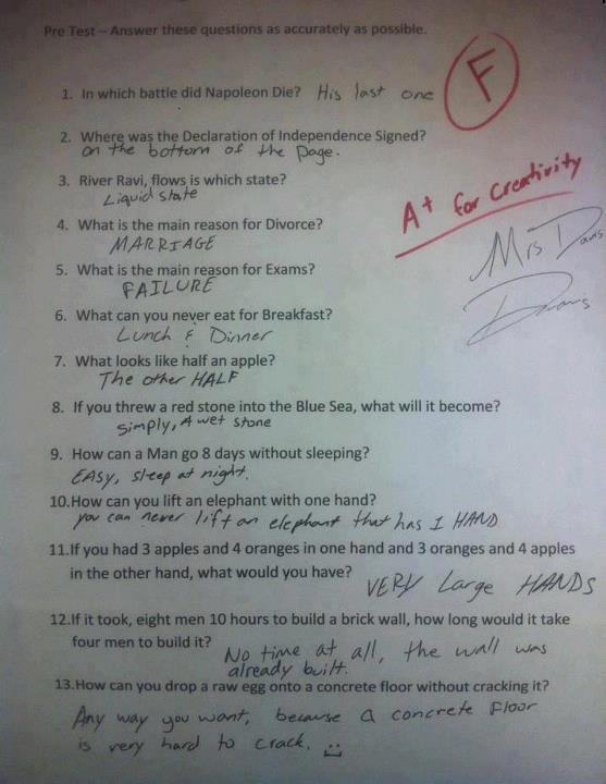 또한 "한손에는 3개의 사과와 4개의 오렌지를, 다른 한 손에는 4개의 사과와 3개의 오렌지를 들고 있다. 당신이 갖고 있는 것은?"이라는 질문에 "매우 큰 손을 가졌다"고 답하는 등 기발한 답안도 보인다.