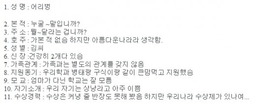 본적을 묻는 질문에는 '누굴~ 말입니까, 주소를 묻는 질문에 '뭘~ 달라는 겁니까?', 성별을 묻는 질문에 '김씨' 등 상상하기 힘든 답변이 쓰여져 있다.
