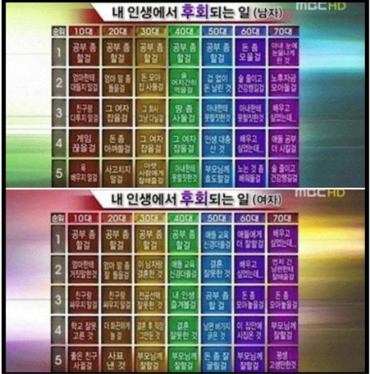 공개 된 설문 결과에 따르면 남자의 경우 10대부터 50대까지 가장 후회되는 일을 '공부'로 꼽았다.
