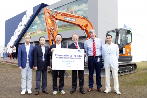 ▲2012 디오픈 기증식: 박용만 두산 회장과 피터 도슨 영국 왕실골프협회장이 21일, 영국 디오픈 두산 홍보 부스에서 중장비 기증 식 후 기념 촬영을 하고 있다. (왼쪽부터 박지원 두산중공업 부회장, 박정원 (주)두산 회장, 박용만 두산 회장, 피터 도슨 영국 왕실골프협회장, 마이클 테이트 영국 왕실골프협회 디렉터, 김용성 두산인프라코어 사장)