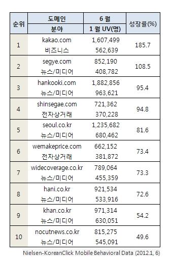 닐슨코리안클릭은 ‘2012년 상반기 최고성장 사이트 및 애플리케이션’부문에서 지난 1월과 6월 도달률 3% 이상인 사이트를 대상으로 방문자수 기준 1월 대비 6월의 성장률이 가장 높은 사이트와 앱을 선정했다.