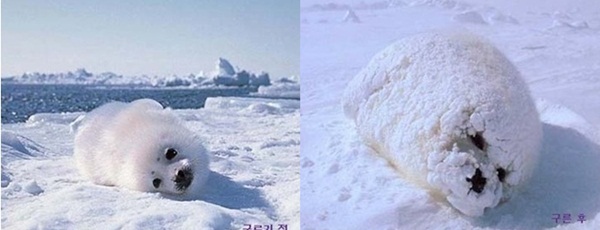 표정도 다르다. 구르기 전 모습은 뽀송한 털에 천진난만한 표정이 귀여움을 자아내는 반면 구른 후 사진에서 물개의 모습은 안쓰러움을 자아낸다.