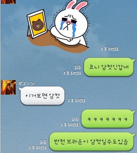 이들은 네이버 라인의 스티커를 사용하다 토끼 캐릭터인 '코니'와 곰 캐릭터 '브라운'의 성별에 대해 의문을 가졌다.