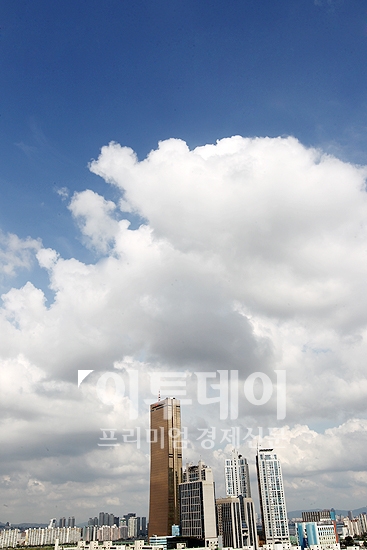 중북부지방에 천둥번개를 동반한 변덕스런 소나기가 내렸지만 날씨는 다시 찜통더위로 돌아왔다. 30일 오후 서울 여의도에서 바라본 63빌딩 위로 파란 하늘이 펼쳐져 있다.