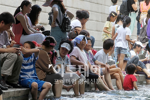 30도를 웃도는 폭염이 밤낮으로 계속되는 2일 오후 서울 청계천 그늘에서 시민들과 관광객들이 더위를 달래고 있다.