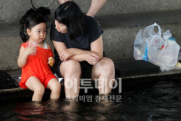 30도를 웃도는 폭염이 밤낮으로 계속되는 2일 오후 서울 청계천 그늘에서 어머니와 아이가 더위를 달래고 있다.