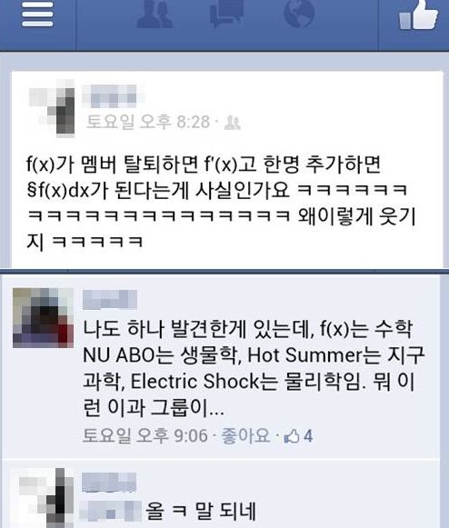 이와 관련 다른 이는 “나도 하나 발견한 게 있는데 f(x)는 수학, NU ABO는 생물학, Hot Summer는 지구과학, Electric Shock는 물리학임. 뭐 이런 이과 그룹이...”라고 적었다.