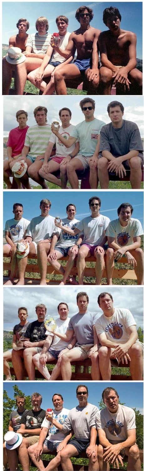 이 사진 속에서 1982년부터 2012년 현재까지 5년 간격으로 같은 포즈의 다섯 친구들이 담겨 있다.