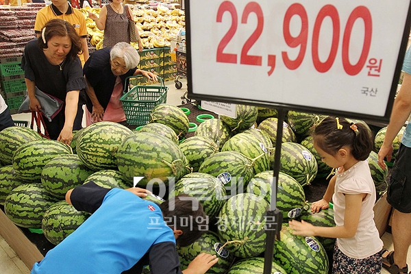 본격적인 휴가철과 계속해서 이어지는 폭염으로 수박의 수요가 급등해 가격이 껑충뛰었다. 5일 오전 서울의 한 대형마트를 찾은 시민들이 수박을 고르고 있다.