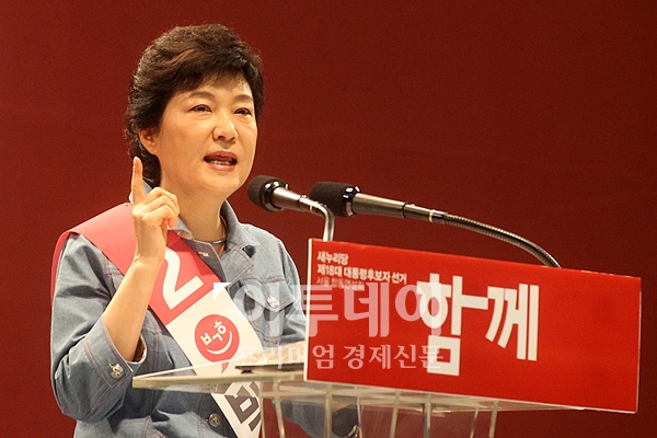 ]새누리당 제18대 대통령후보자 선거 서울 합동연설회가 열린 6일 오전 서울 올림픽체조경기장에서 박근혜 후보가 지지를 호소 하고 있다.