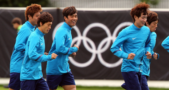 브라질과의 준결승을 앞둔 2012 런던올림픽 남자 축구대표팀이 7일 영국 맨체스터 그램마 스쿨 훈련장에서 밝은 표정으로 훈련을 하고 있다.