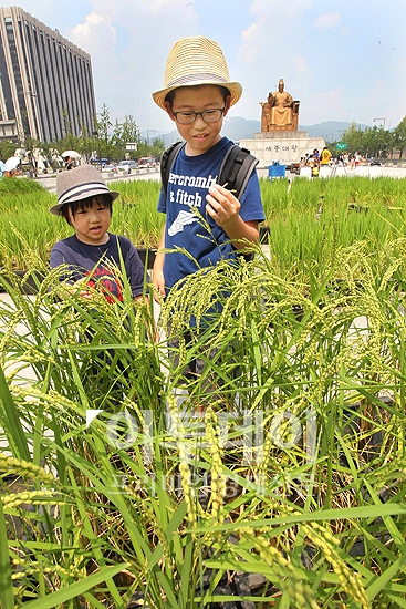 입추가 지나고 폭염이 한풀 꺾인 9일 오후 서울 광화문 광장에 벼가 익어가고 있다.