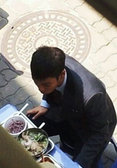 사진 속에는 영화 '동창생' 촬영 중 식사로 삼계탕을 먹는 탑의 모습이 담겨 있는 것.