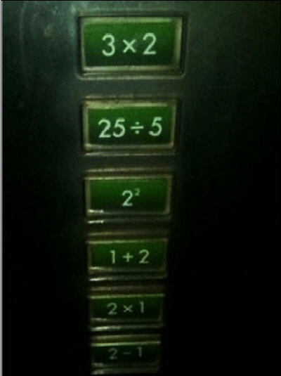 최근 온라인 커뮤니티 게시판에는 '약간 복잡한 버튼'이란 제목으로 사진 한 장이 게재됐다. 사진 속 엘레베이터의 층수는 일반 아라비아 숫자가 아니라 수학 공식으로 표시돼 있다. 1층은 '2-1', 2층은 '2X1', 3층은 '1+2', 4층은 '2²', 5층은 '25÷5' 등이다.