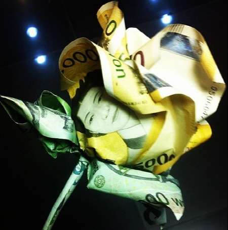 공개된 사진에는 5만 원짜리 지폐와 만 원짜리 화폐로 접은 장미꽃 한 송이가 담겨져 있다. 네티즌들은 지폐로 꽃을 만들었다는 아이디어에 집중하기 보다 돈을 과시하는 불쾌한 행동이라는 지적에 목소리를 높이고 있다.
