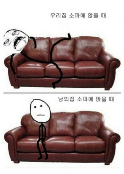 먼저 자신의 집 소파에는 앉을 때 거의 드러눕는 정도다. 하지만 남의 집 소파에 앉을 땐 마치 이등병 군인처럼 가지런하고 조심스러운 모습으로 앉는다.