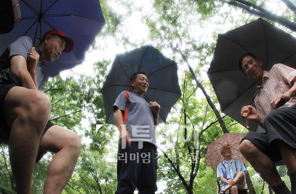 서쪽으로 다가오는 기압골의 영향으로 전국적으로 내리는 비에 폭염의 기세가 꺾이고 있다. 기상청은 중부지방엔 12일 밤부터 오는 13일 오전 사이에, 남부지방엔 오는 13일 오전부터 밤사이에 벼락을 동반한 시간당 30mm 안팎의 국지성 호우가 쏟아질 것으로 예보했다. 12일 오후 서울 용산구 효창공원에서 시민들이 우산을 쓰고 이야기꽃을 피우고 있다.