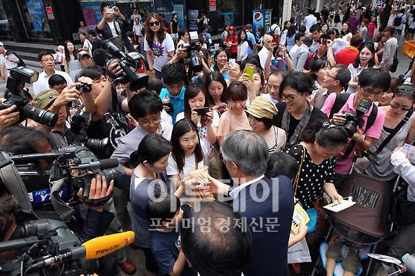 문재인 민주통합당 대선경선후보가 13일 오후 서울 명동에서 선거인단 참여 캠페인을 하며 시민들과 인사를 나누고 있다.