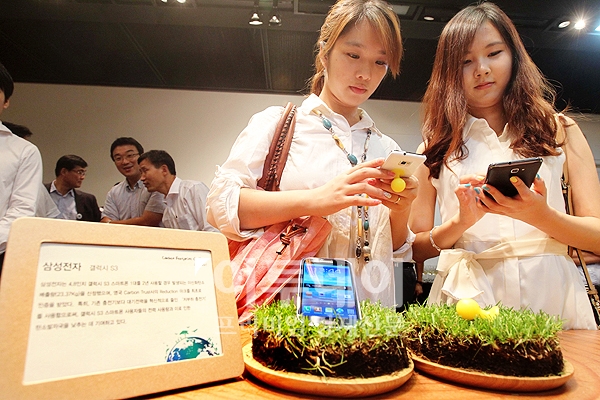 저탄소, 에너지 고효율 제품과 예술의 만남 전시회가 오픈한 16일 오후 서울 종로구 인사동 인사아트센터에서 관람객들이 삼성 갤럭시 S3를 살펴보고 있다.